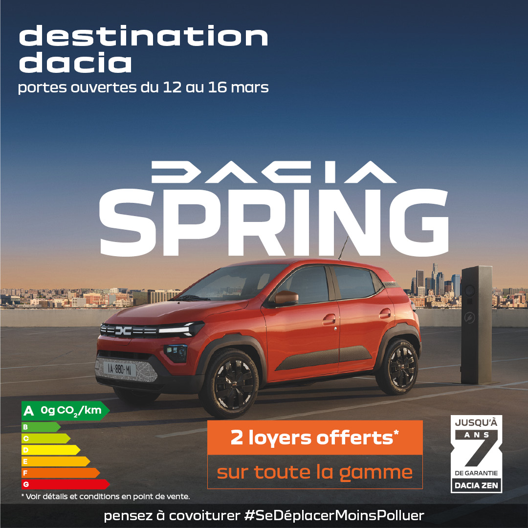 (3) Prix TTC en achat intégral (batterie incluse) hors options pour les particuliers selon tarif constructeur conseillé, prime CEE de 380 € déduite. Prime CEE de 380€ déduite. Montant indicatif de la prime CertiNergy (siren 798641999) pour la valorisation d’un achat ou d’une location (durée≥24 mois) par un client particulier d’un véhicule neuf particulier électrique M1 Dacia Spring, au titre du dispositif des certificats d’économie d’énergie (CEE), non soumis à TVA, dans le réseau Dacia participant du 01/03/2026 au 31/03/2026. Le montant de la prime dépend de la qualité du client (particulier, entreprise, collectivité, loueurs, autre personne morale) et, pour les entreprises et les collectivités de la taille de leur parc automobile. Voir conditions d’éligibilité et modalités sur la page https://www.dacia.fr/certificats-economies-energie-cee.html et auprès de votre revendeur. GAMME DACIA SPRING : CONSOMMATIONS HOMOLOGUÉES EN CYCLE MIXTE (WH/KM) : 124/141. ÉMISSIONS DE CO2 : 0 LORS DU ROULAGE, HORS PIÈCES D’USURE. 225 KILOMÈTRES D’AUTONOMIE EN CYCLE MIXTE WLTP ET JUSQU’À 315 KILOMÈTRES D’AUTONOMIE EN CYCLE URBAIN WLTP, SELON VERSION ET ÉQUIPEMENTS. BORNE DE RECHARGE NON INCLUSE. WLTP WORLDWIDE HARMONIZED LIGHT VEHICLES TEST PROCEDURES (LA PROCÉDURE D’ESSAI MONDIALE HARMONISÉE POUR LES VÉHICULES LÉGERS). Modèle présenté : Dacia Spring extreme 65 avec option peinture rouge brique.